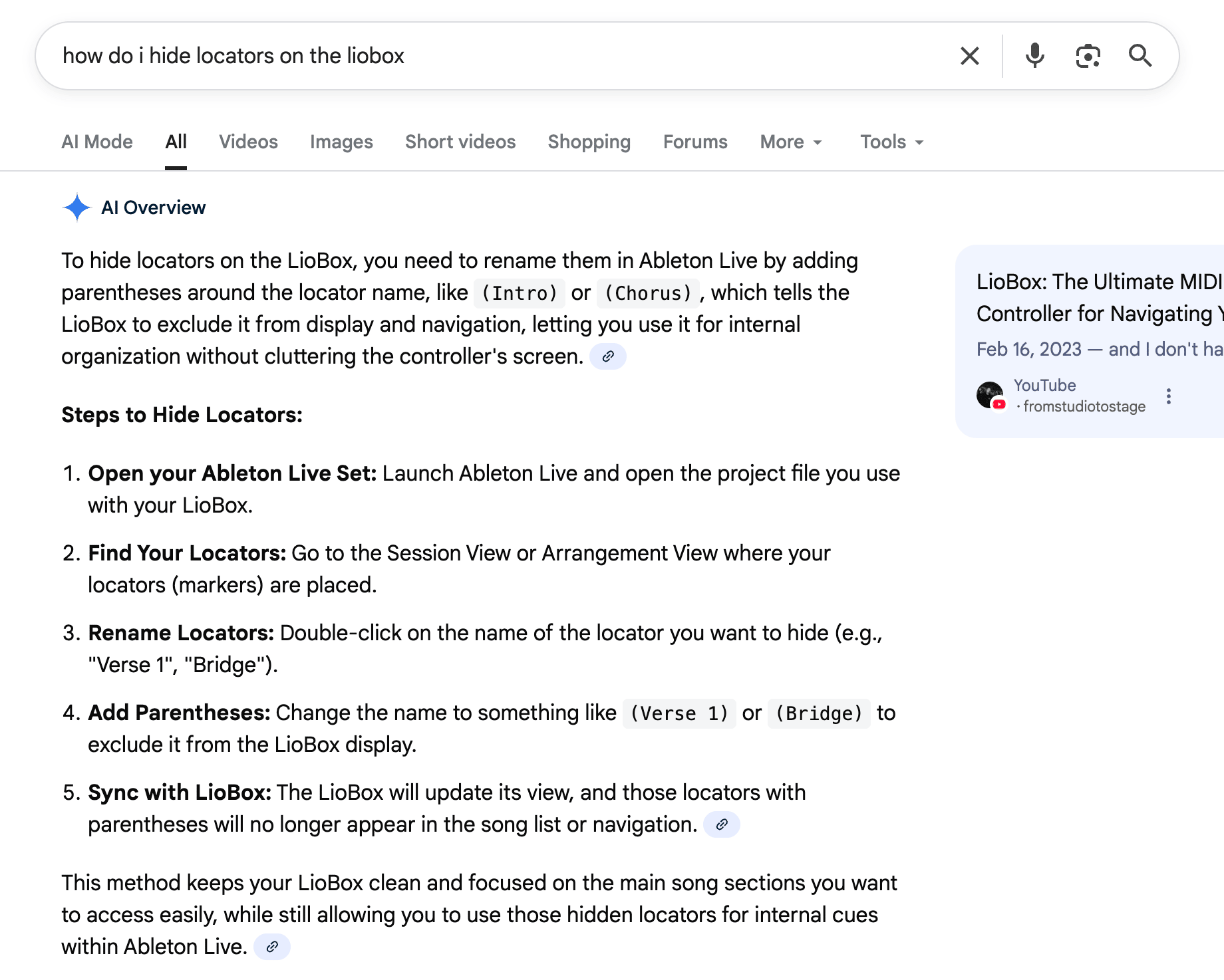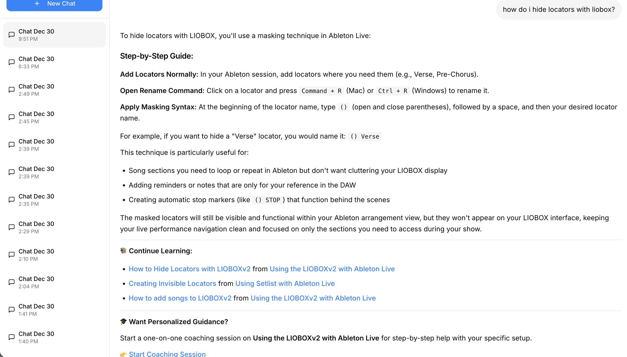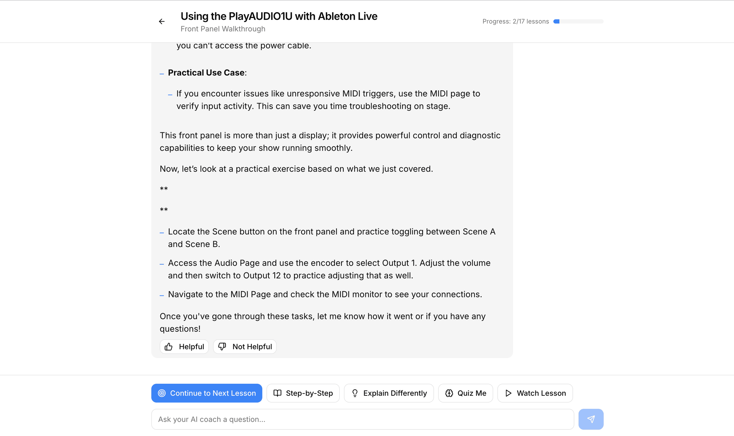 I solved some of those issues with The Playback Method™, the world's first (and only) playback curriculum that gave users a direct path to learn, but still the biggest problem is, what about those quick answers? Also, how can we speed up the learning process. Instead of watching an hour long course, can we make this an almost instant process? What if we could take all the knowledge contained in those 29,000 minutes worth of content, and make it accessible much faster. Today I'm releasing the next generation of From Studio to Stage in beta, built on PlaybackLLM™. Guides Guides are text only step by step guides that help you quickly master new skills. Quickly learn, step-by-step, how to setup your new audio interface, or MIDI Controller. You can easily filter and find guides to learn exactly what you want as quickly as possible. Whenever there's a course available that matches the guide you're searching for, you can click the watch course, or watch lesson link and jump directly to that lesson. Guides give you only the info you need with none of the fluff. Quickly scan the guide to follow along and get the answers you need. Coach Now you can be coached through the course content at your own pace. While you learn you can choose to get step-by-step instructions, have the content explained differently, ask to be quizzed to test your knowledge, or if there's a corresponding lesson video, you can get a link directly to that lesson. Guides and Coach are built on top of PlaybackLLM™, so they're using the knowledge and experience I've been building for the past seven years. But what's next is even more powerful. Solving The Biggest ProblemGuides solves the ability to quickly learn a new skill and get access to the exact info you need, and nothing less. Coach helps you learn material at your own pace, but what about when you have a quick question? I've had students tell me for years, "Will, I just need a site search. I want to search for a course, find the right lesson, watch it, and get my answer". While that's certainly possible. It doesn't solve the problem...quickly. We've also had a community forum since launch, that primarily became a channel for students to ask questions. This isn't an effective way to learn. You ask a question, you wait for an answer from someone in the community, and you hope the answer is correct. There's got to be a better way... that's where Ask comes in. AskAsk allows you to get your playback questions answered instantly, at anytime, and anywhere. Let's try this out.. I want to learn how to hide locators on my LIOBOX. Let me try google: While it's very convenient to get an answer instantly.. it's also wrong. Classic AI...Let's try ChatGPT: At least Google tried to make something up. That's the problem with AI. AI in and of itself doesn't know anything. It needs knowledge and context. It needs access to the knowledge, and needs a focused context. That's exactly what PlaybackLLM™ is. It's the knowledge and context about Playback. And it's what powers Ask. Let's see what Ask gives us: Not only does Ask give you the right answer, it points you to the exact course and lesson where it found the answer, and provides you a link to the guide as possible. Plus, it encourages you to create a coaching session to go further. This is the web interface for ask, but it becomes even more powerful, because ask is where you are.